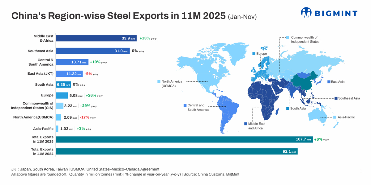 Morning Brief: China’s steel exports continued at a robust pace in January-November 2025 in sharp contrast to the steady downtrend in crude steel production. Exports increased by 6.7% y-o-y to 107.7 million tonnes (mnt) in January-November, easily surpassing the 100-mnt mark with November’s total of 9.98 mnt.