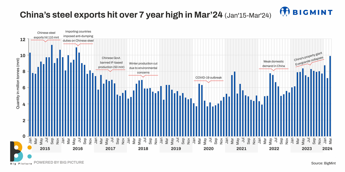 Chinese steel exports have continued last year’s northward march well into 2024. Data maintained with BigMint reveals that March 2024 volumes hit an over-seven-year high of 9.89 million tonnes (mnt). The closest this figure comes to was recorded at 10.30 mnt in July 2016. On a m-o-m basis, March volumes were up a significant 39% from 7.17 mnt in February. Y-o-y, exports were up 25% compared to 7.89 mnt seen in March 2023. Over January-March, 2024, cumulative volumes amounted to nearly 26 mnt, up 28% against 20 mnt seen in the same period last year.