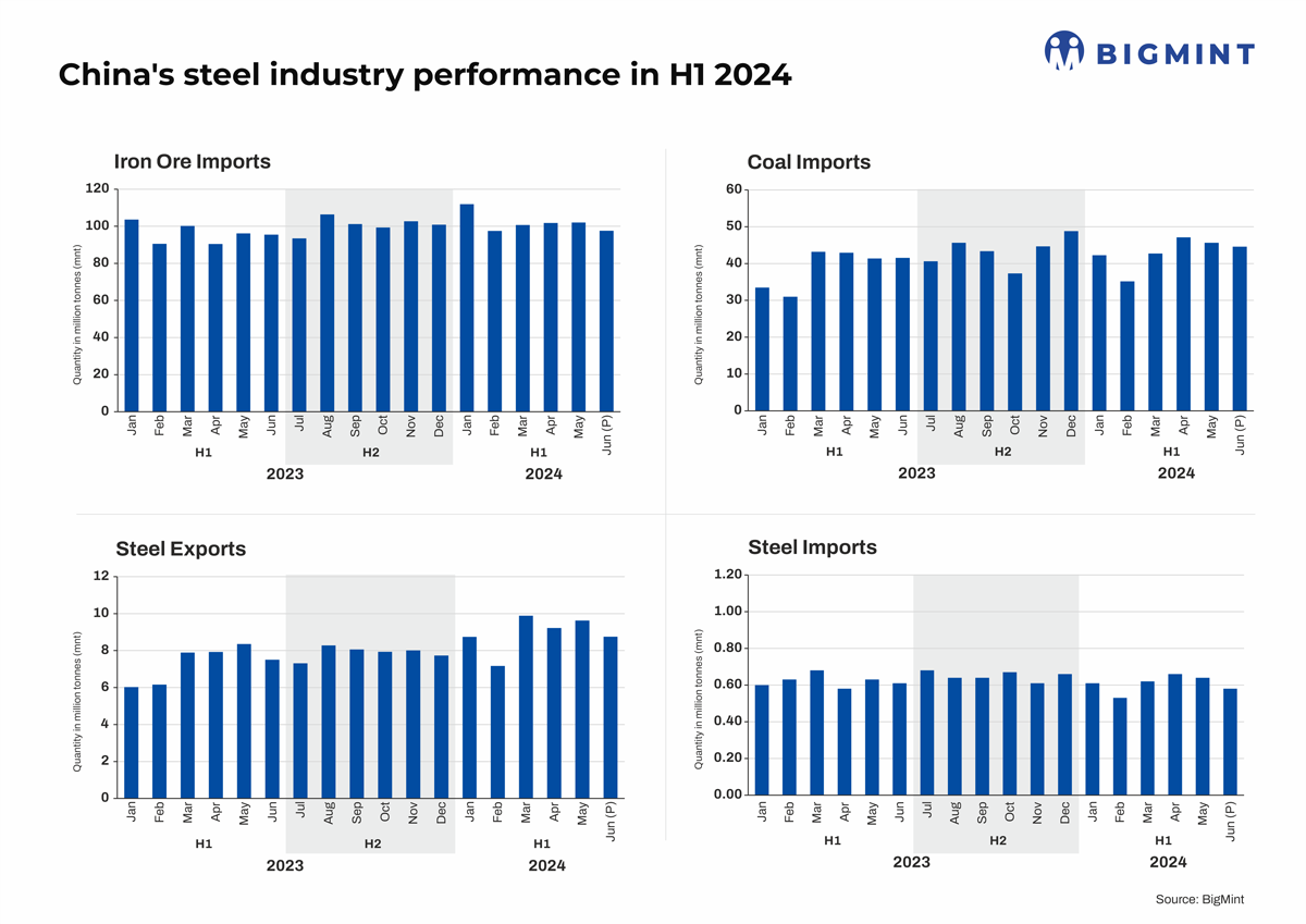 Steel exports, a key component of the Chinese steel industry, showed a 24% y-o-y increase in this period to around 53 million tonnes (mnt) against 43 mnt seen in the same period in 2023. June volumes, however, were down 9% m-o-m.