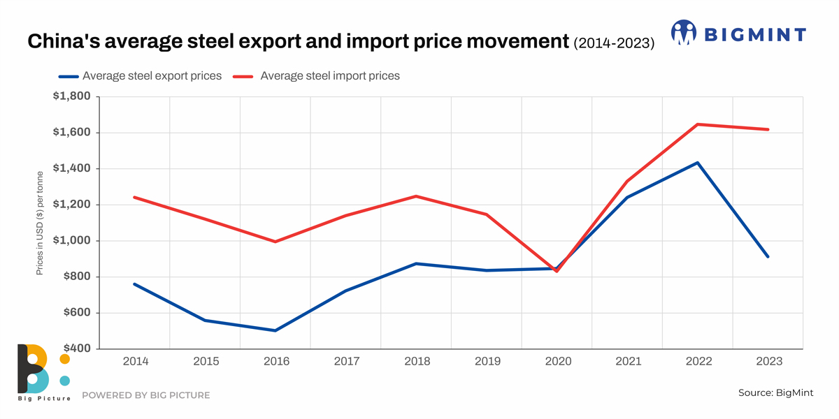 The spread between steel import and export prices in China widened to a record 10-year high of $707/tonne (t) in calendar 2023 (CY’23), as per data available with BigMint. In 2023, the average price per tonne of steel exported by China was at RMB 6,569/tonne ($914/t) a y-o-y decrease of 31%, ending six consecutive years of increase. Within this quantum, the share of exports of steel items with a unit price of more than RMB 6,000/t ($835/t) was about 38%, or 30 percentage points lower than in the previous year, proving the steady erosion in Chinese steel export prices over the last year. Average export prices fell 36% last year when pitted against the 10-year high of $1,434/t in 2022.