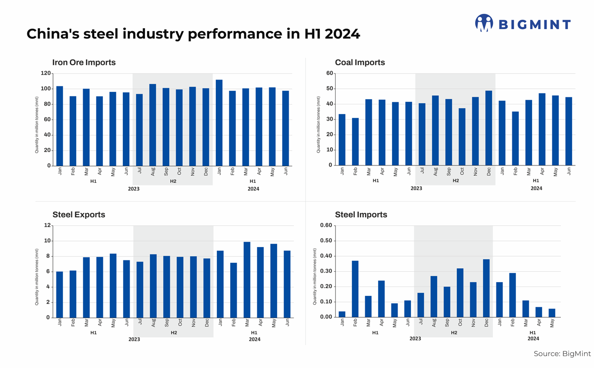 China’s steel exports, and iron ore and coal imports all showed a positive trend in the first half (January-June) of calendar 2024 (H1CY’24), reveals data from the General Administration of Customs. Steel exports, a key component of the Chinese steel industry, showed a 24% y-o-y increase in this period to around 53 million tonnes (mnt) against 43 mnt seen in the same period in 2023. June volumes, however, were down 9% m-o-m.After slowing down over January-May, the exports growth momentum again picked up slightly over January-June. Volumes still remained significant because, real estate, which consumers 60% of steel demand, still has not recovered substantially. Over January-May, real estate development investment fell and new housing construction area fell 10% and 24% respectively. New commercial housing sales area dropped 20%, and sales by 28%.