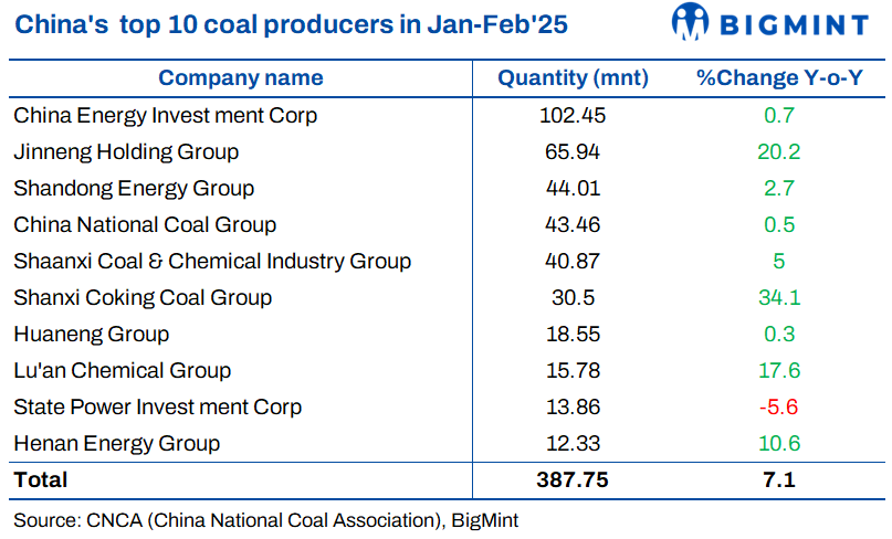 Mysteel Global: China’s top 10 coal producers mined a combined 390 million tonnes of raw coal during January-February, up by 25.7 million tonnes or 7.1% from the same period last year, data from the China National Coal Association (CNCA) showed. Their output accounted for 50.6% of China’s total coal production during the period.