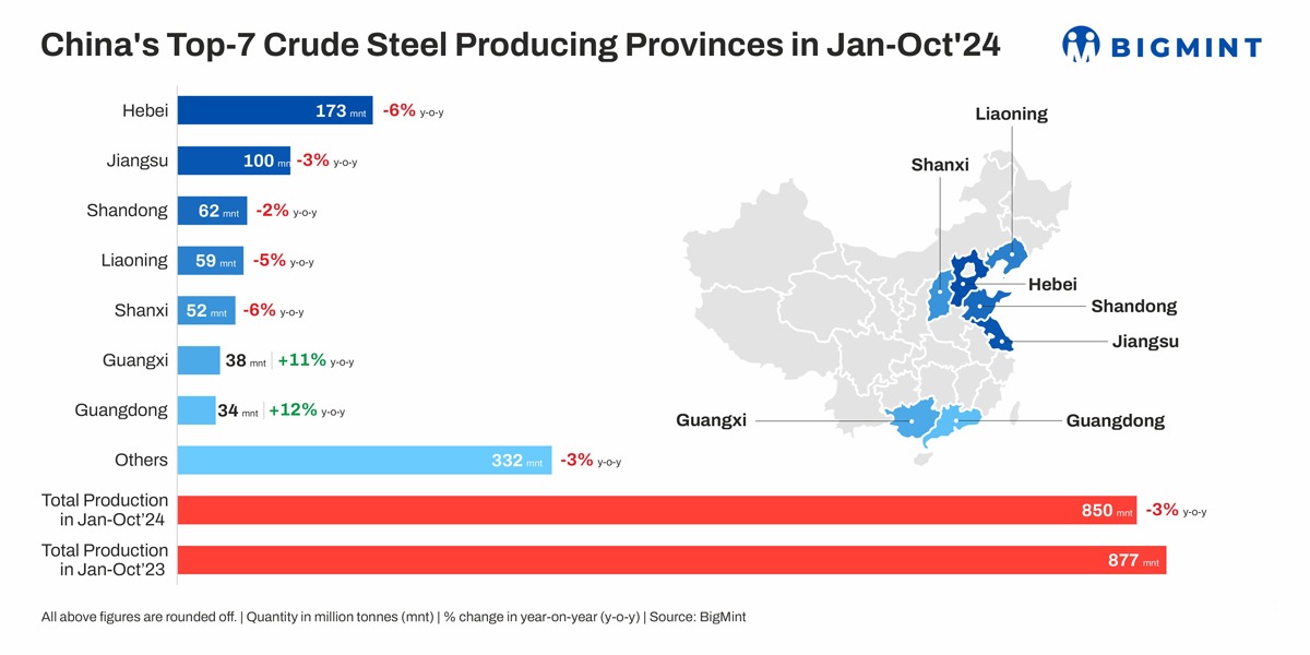 China’s Top-7 Crude Steel Producing Provinces in Jan-Oct’24