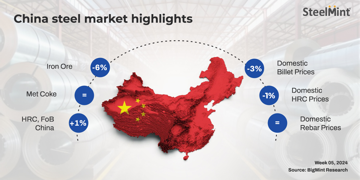 Chinese steel prices experienced a w-o-w decrease, driven by fall in Shanghai Futures Exchange (SHFE) futures. Spot iron, billet, coking coal prices witnessed a w-o-w decline. In addition, domestic HRC and rebar prices showed their downward trend this week, while HRC export offers increased.