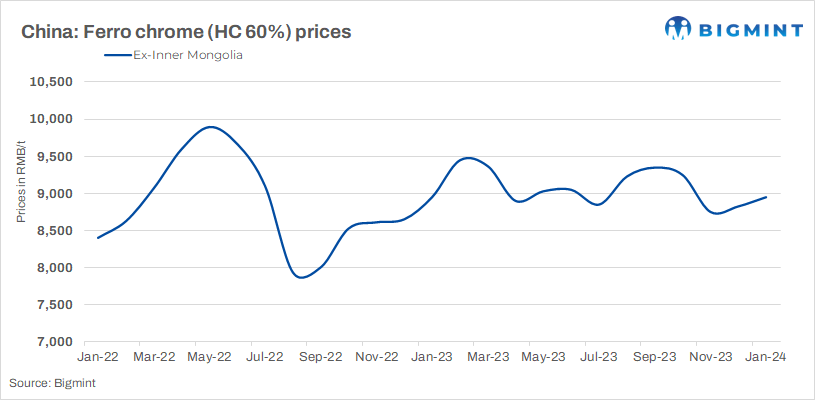 Ferro chrome prices in China experienced a decline of RMB 50/t ($7/t) w-o-w, with buyers showing reluctance to accept higher-priced offers. High-carbon ferro chrome prices in China were within the range of RMB 8,600-8,800/t ($1,215-1,243/t), while medium-carbon ferro chrome remained stable around RMB 14,000-14,100/t ($1,977-1,991/t). All prices are inclusive of tax and are ex-works.
