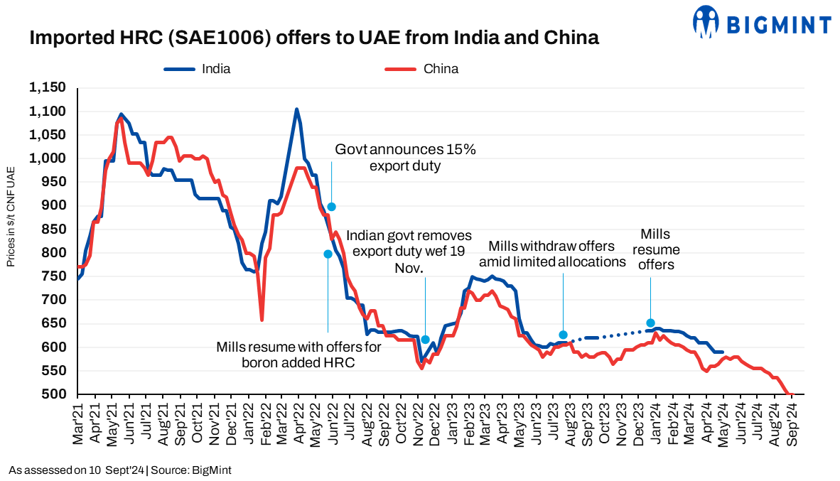 Moreover, imported HRC offers from Japan to ME stood at $490/t CFR UAE. A deal of around 25,000 tonnes (t) was heard concluded for November shipments. However, Indian mills have continued to hold there HRC export offers to the ME.