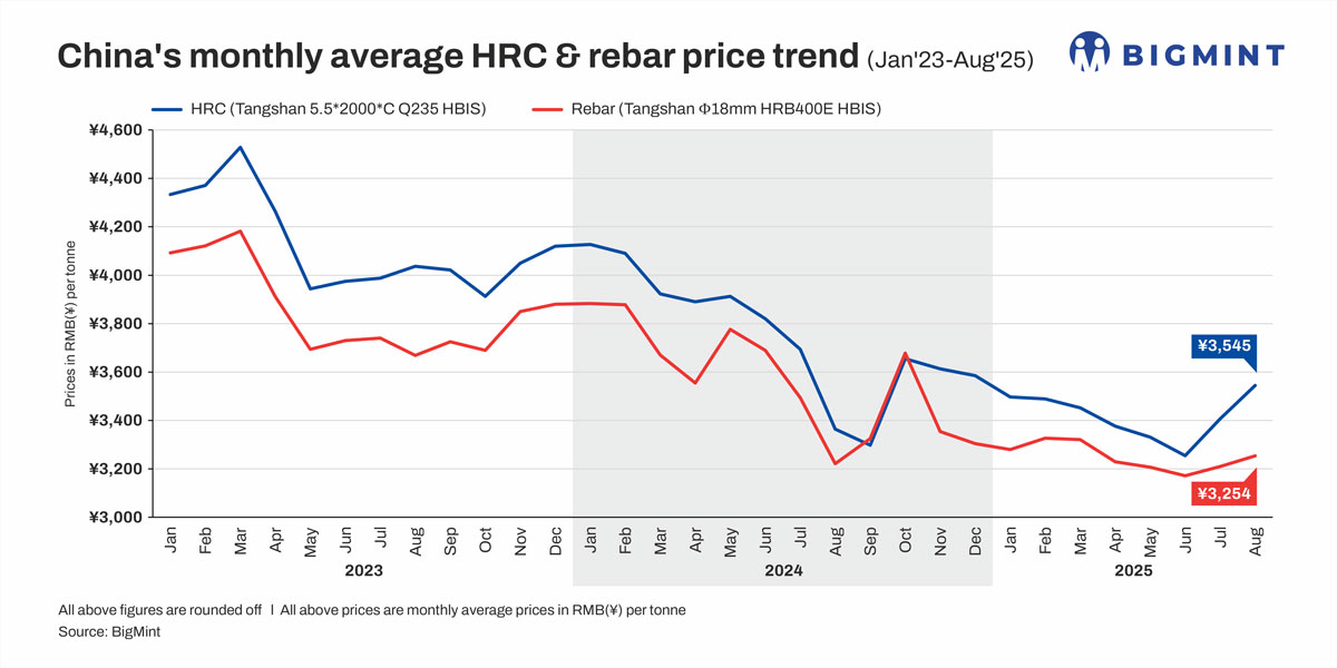 Chinese monthly average HRC, rebar prices edge up in Aug’25