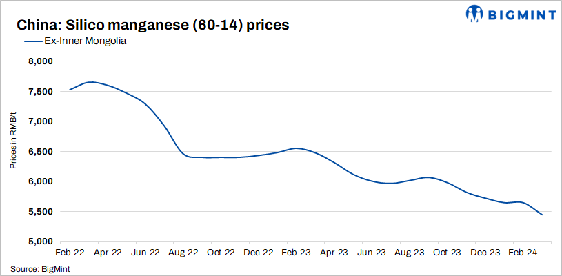 Silico manganese prices in China dropped by RMB 200/t ($28/t) this week owing to a cautious market environment. Prices were at around RMB 6,110/t to 6,210/t ($849/t-$863/t). All prices were ex-works and inclusive of taxes.