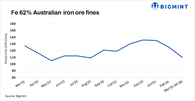 For example, Mysteel SEADEX 62% Australian Fines sat at $101.25/dmt CFR Qingdao on March 27, losing a total of $5.4/dmt from the prior week.