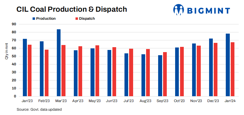 During the month, coal dispatches posted rise of 4.8% y-o-y to 67.6 mnt in January 2024 as compared with 64.4 mnt in January 2023. The cumulative dispatch in April-January 2024 recorded at 619.5 mnt as against 572.3 mnt in the same period last year.