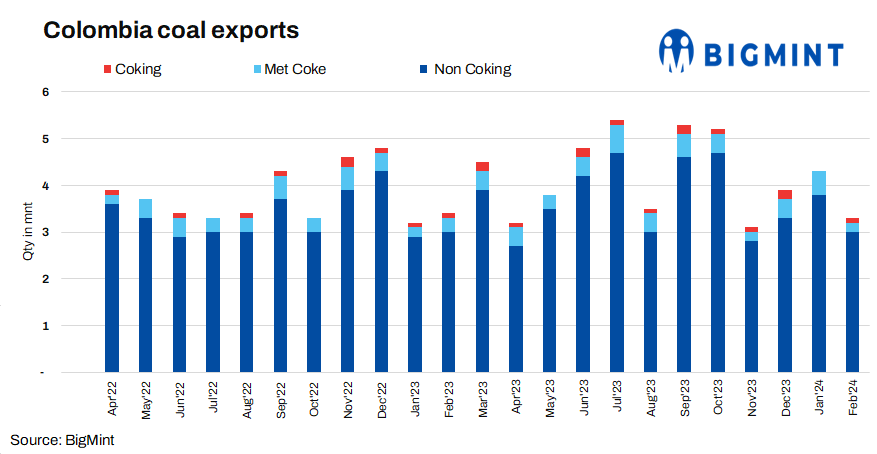 Colombia’s coal exports dropped by 22% m-o-m to 3.36 mnt in Feb’24 as against 4.28 mnt in Jan’24. Turkey led as the largest importer at 0.33 mnt (drop by 46% m-o-m), followed by the Netherlands at 0.32 mnt in the month under review. Additionally, exports to Brazil fell by 22% m-o-m to 0.25 mnt in Feb’24 as against 0.32 mnt in Jan’23, while no export vessels reached India during the month.