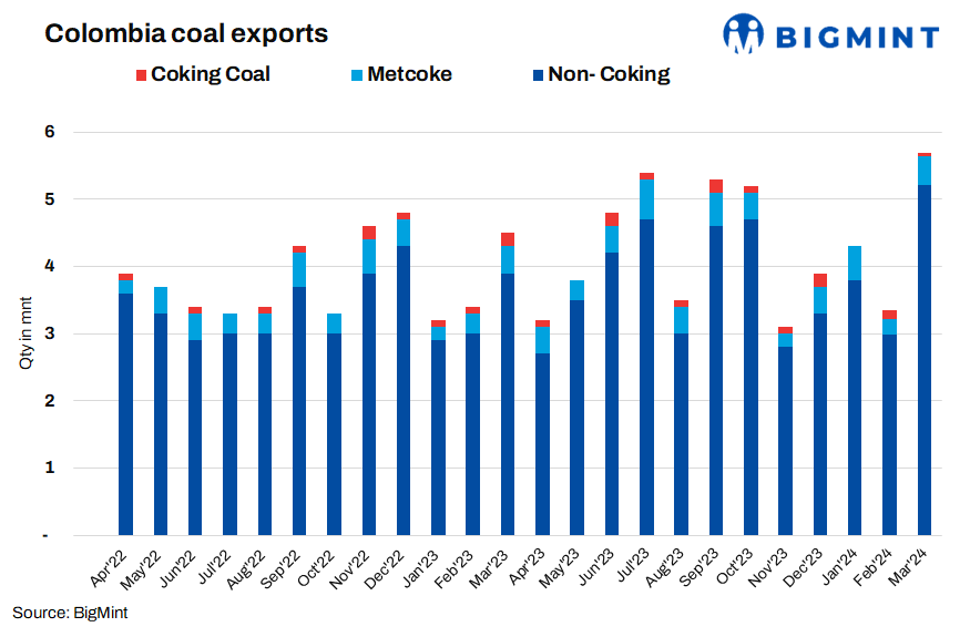 Colombia’s coal exports increased by 69% m-o-m to 5.68 mnt in Mar’24 as against 3.36 mnt in Feb. Turkiye and South Korea were the largest importers at 0.32 mnt, followed by India at 0.43 mnt during Mar. Exports to Netherlands fell m-o-m to 0.17 mnt in Mar as against 0.32 mnt in Feb, while exports to Mauritius increased more than twofold to 0.33 mnt versus 0.14 mnt in Feb.