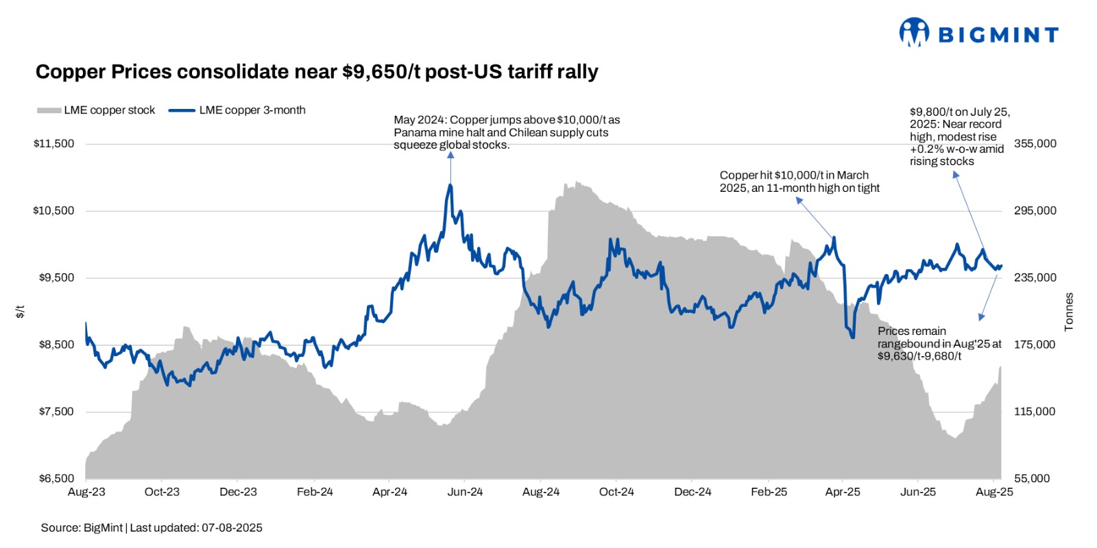 Copper prices on the London Metal Exchange (LME) edged slightly higher week-on-week, with the 3-month contract closing at $9,710/t on August 8, 2025, up from $9,700/t on August 1, 2025.