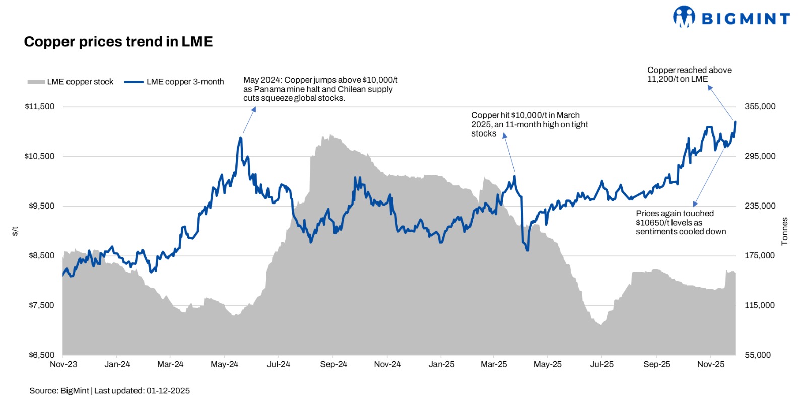 Copper prices rose sharply to $11,660/t on 5 December, up from $10,900/t on 28 November, registering a 7% w-o-w increase. The rally reflects tightening refined availability, stronger fund inflows, and a supportive macro environment.