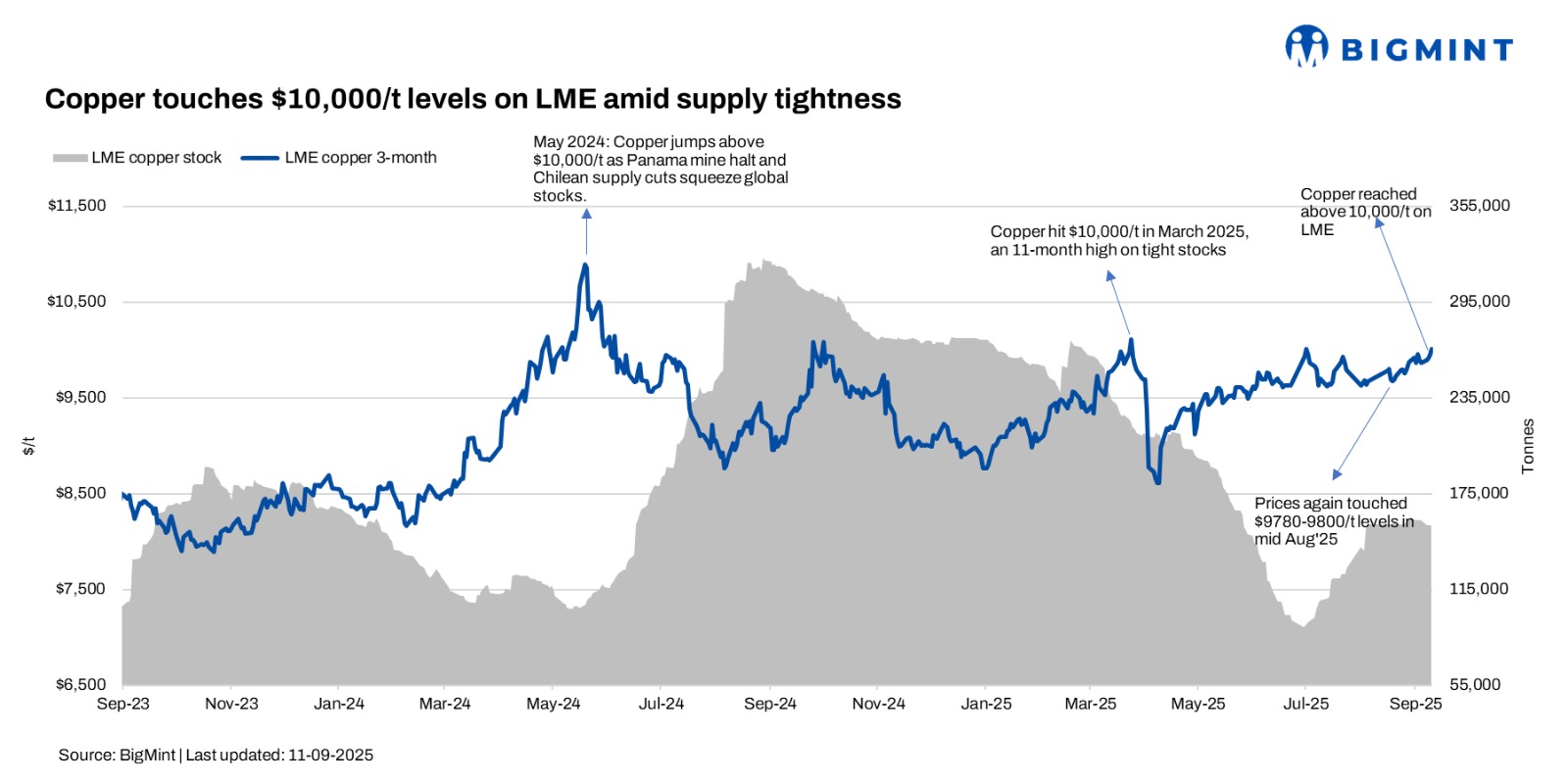 W-o-w, LME cash copper eased slightly to $9,847/t on 10 September, versus $9,881/t a week earlier. Still, with falling stocks and mine disruptions, the market remains tight.