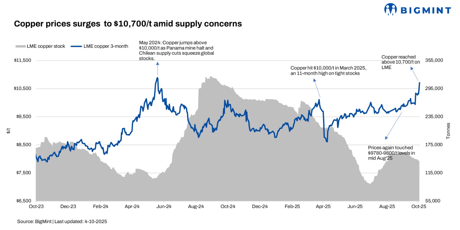 The benchmark three-month copper contract on the London Metal Exchange (LME) closed at $10,700/t on 4 October 2025, marking a gain of $400 from 26 September. The move reflects a confluence of bullish forces — tightening supply, falling inventories, steady demand, and supportive currency trends.