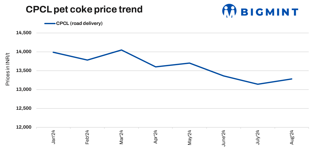 Chennai Petroleum Corporation Limited (CPCL) has raised its pet coke prices for road supply for August’24 by INR 140/t to INR 13,280/t. There is no rake loading facility by CPCL. The average dispatch of pet coke is 40,000-45,000 t per month. It may be noted here that CPCL majorly supplies to Tamil Nadu and Andhra Pradesh.