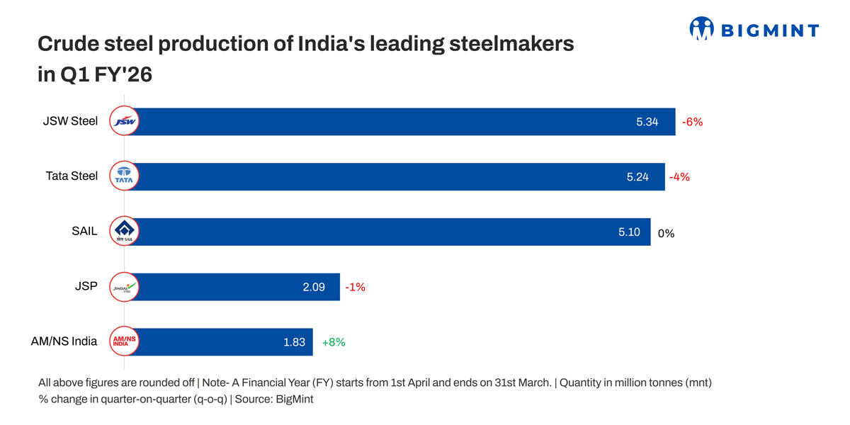 The production enthusiasm seen in Q4FY’25 softened evidently, with JSW, Tata Steel, and JSP recording lower volumes q-o-q. JSW Steel (standalone) was as the leading producer in Q1FY’26, with 5.70 million tonnes (mnt). The 6% decline q-o-q was due to planned maintenance shutdowns, which led to lower capacity utilisation at 87% this quarter against 93% in the previous one.