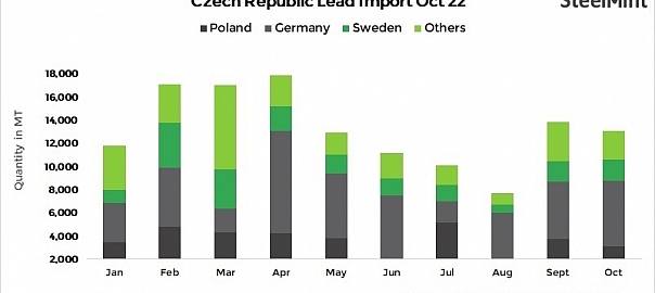 - Imports of semi-finished lead products into Czech Republic decreased by 6% m-o-m to 13,055 t in Oct’22 from 13,866 t in Sept’22, as per SteelMint’s customs data.