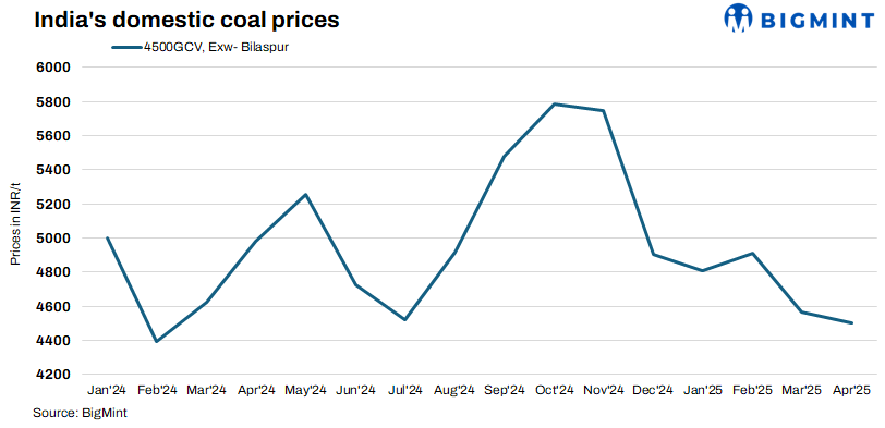 Domestic coal prices remained stable this week, with 4500 GCV and 5000 GCV grades at INR 4,500/t and INR 4,950/t, respectively, exw-Bilaspur. Market sentiment stayed dull as most buyers have sufficient stock and avoided fresh bookings. In recent SECL auctions, only 10-20% of the total non-coking coal offered was sold, highlighting weak demand and lack of buying interest.