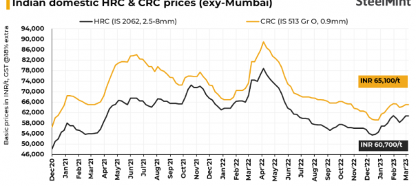 Domestic trade-level prices of HRC-CRC remain rangebound this week. The market is muted amid the Holi festive holidays, distributor sources informed. SteelMint’s assessment for HRC (IS2062, 2.5-8mm) stood at around INR 60,000-61,000/t exy-Mumbai. CRC is assessed at INR 64,500-65,500/t exy-Mumbai. Prices are basic and exclude GST at 18%.