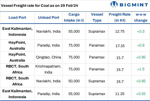 - Australia to India freight rises w-o-w: Freight rates from Australian port head north w-o-w for the Indian as well as for Chinese ports. Notably, Port Hay Point Berth 3 is currently undergoing maintenance shutdown from 25 February-5 March, 2024, while DBCT Port Berth 2 is scheduled for maintenance from 21 February-13 March, 2024. As per sources, the shipment is scheduled on mid March dates, a miner have fixed an enquiry for metallurgical coal. The trade activities will resume as the enquiries have supported freight to rise.