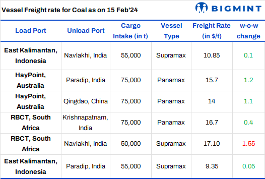 Australia to India freight rises on weather condition: Freight rates from Australian port inched up by around $1/t w-o-w for the Indian as well as for Chinese ports. Exporters encountered production and vessel delays from various coal-producing mines. Moreover, Kembla Port in Australia underwent maintenance shutdown from February 12 to 15, 2024. These circumstances disrupted shipping schedules, affecting coal supply chains and likely causing freight rate escalations.