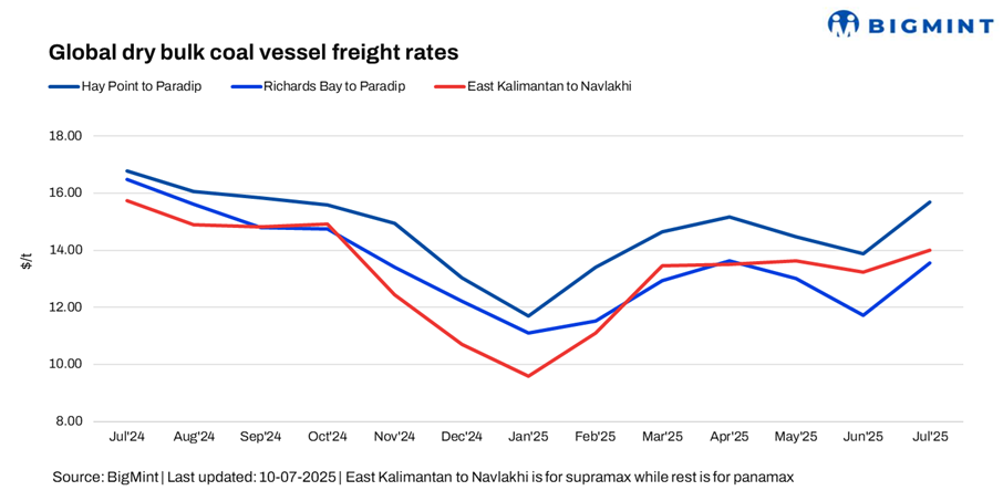 - Australia (Hay Point)-India (Paradip), Panamax: Freight rates from Australia to India increased by $0.8/dry metric tonne (DMT) w-o-w, with BigMint’s latest assessment placing the Hay Point to Paradip route at $16.10/DMT. Indian buyers, particularly blast furnace operators, increased coal procurement during the monsoon season to hedge against potential supply disruptions stemming from inland logistical bottlenecks and port congestion. This seasonal stockpiling boosted spot demand for Panamax vessels on the Australia-India route, as timely deliveries became a priority to maintain operations. Although coking coal prices remained relatively stable, heightened urgency to secure cargoes intensified competition for tonnage, pushing freight rates higher.