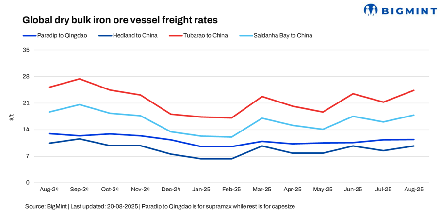- India (Paradip)-China (Qingdao), Supramax: Freights for Supramax vessels from the Indian Ocean to China inched down by $0.7/dry metric tonne (dmt) w-o-w to $11/dmt. However, persistent monsoon rains disrupted mining and dispatch activities, driving up domestic prices and making exports less feasible.Demand remained moderate but eased compared to the previous week, as buyers mostly limited their purchases to covering immediate needs.