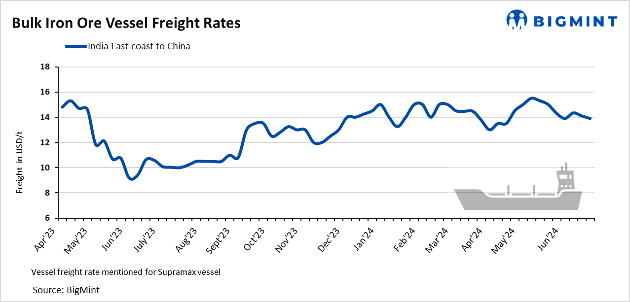 Asia-Pacific Supramax dry bulk (50,000-55,000 t) freight rates for an iron ore vessel from the east coast of India to China inched down by $ 0.2/t this week to $13.9/t on 26 June, as per BigMint’s assessment.