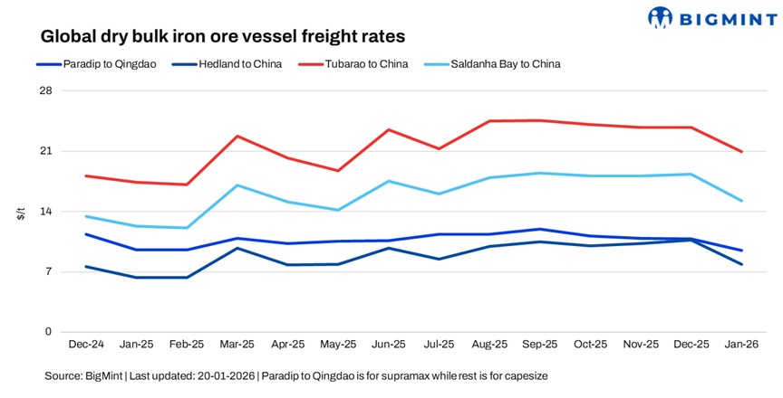 Dry bulk iron ore freights declined w-o-w on 20 Jan’26 amid steady tonnage supply. However, improved fixtures, firmer bunkers, and Baltic index gains lifted Feb laycan rates above Jan, softening corrections and pointing to upward momentum later this week.