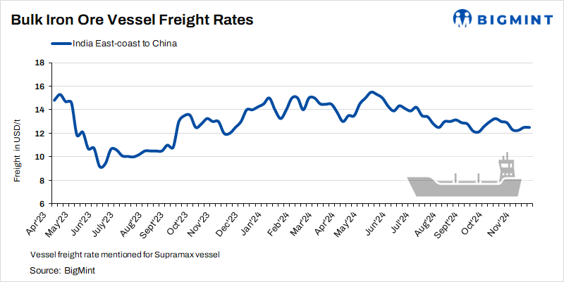 According to BigMint’s assessment, Asia-Pacific Supramax dry bulk freights (50,000-55,000 tonnes) for iron ore shipments from the east coast of India to China remained stable w-o-w to $12.5/t on 20 November.