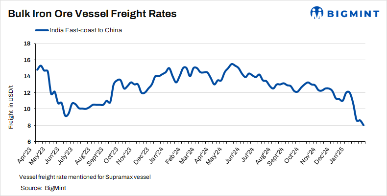 According to BigMint’s assessment, Asia-Pacific Supramax dry bulk freights (50,000-55,000 t) for iron ore shipments from the east coast of India to China fell by $0.6/t w-o-w to $8/t on 29 January.