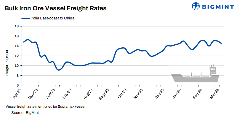 Asia-Pacific Supramax dry bulk (50,000-55,000 t) freight rates for an iron ore vessel from the east coast of India to China were recorded at $14.5/tonne (t) on 6 March, 2024, according to BigMint’s assessment.