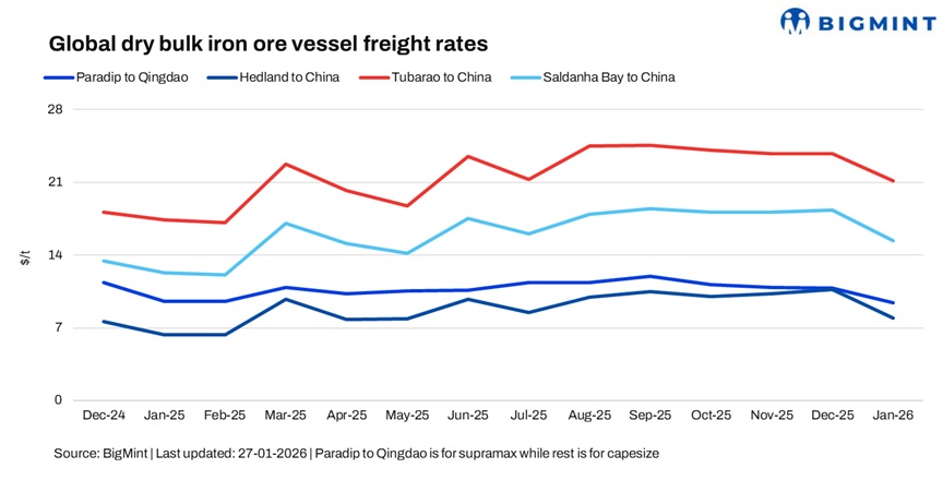 Iron ore freights rose w-o-w on 27 Jan’26, supported by firmer demand and tightening tonnage. Australia, Brazil, and South Africa saw fixtures conclude at higher levels, while Indian routes stayed supported despite subdued cargo demand.