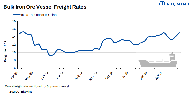 Asia-Pacific Supramax dry bulk (cargo capacity 50,000-55,000 t) freight rates for an iron ore-loaded vessel from the east coast of India to China was recorded at $15/tonnes (t) on 31 January, 2024, recording an increase of around $1/t w-o-w, according to BigMint’s assessment.