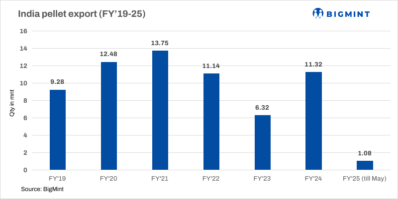 An eastern India-based pellet producer has recently concluded an export deal for 55,000 t of pellets (Fe63%, 8% SiO2+ Al2O3). The deal was heard concluded at around $115/t CFR China for Jul’24 shipment, as per sources. India’s pellet exports increased m-o-m to 0.89 mnt in May as against 0.20 mnt in Apr.