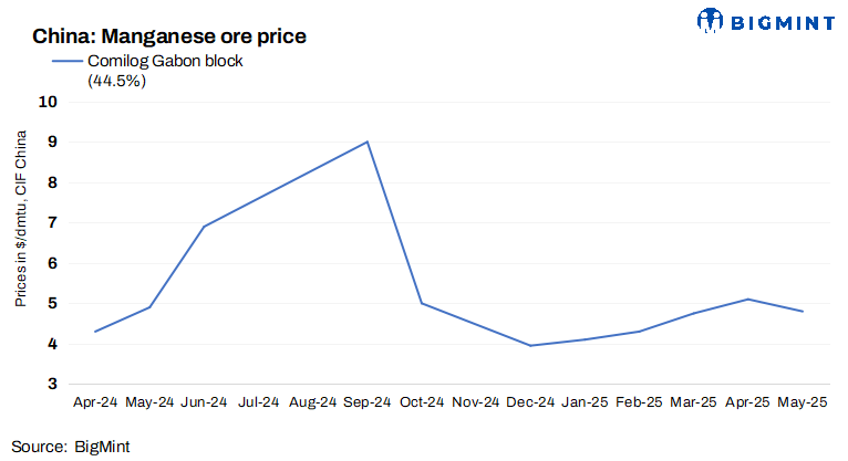 • Eramet, the world’s leading manganese ore producer, posted a 7% y-o-y decline in Q1CY’25 output at 1.7 mnt.