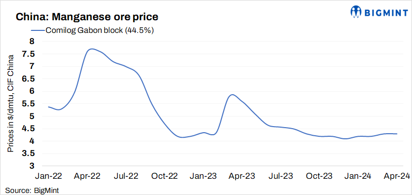 The price index for manganese ore (CIF China 44%) averaged $4.3/dmtu during the quarter, marking a 21% decrease compared to Q1 CY23.
