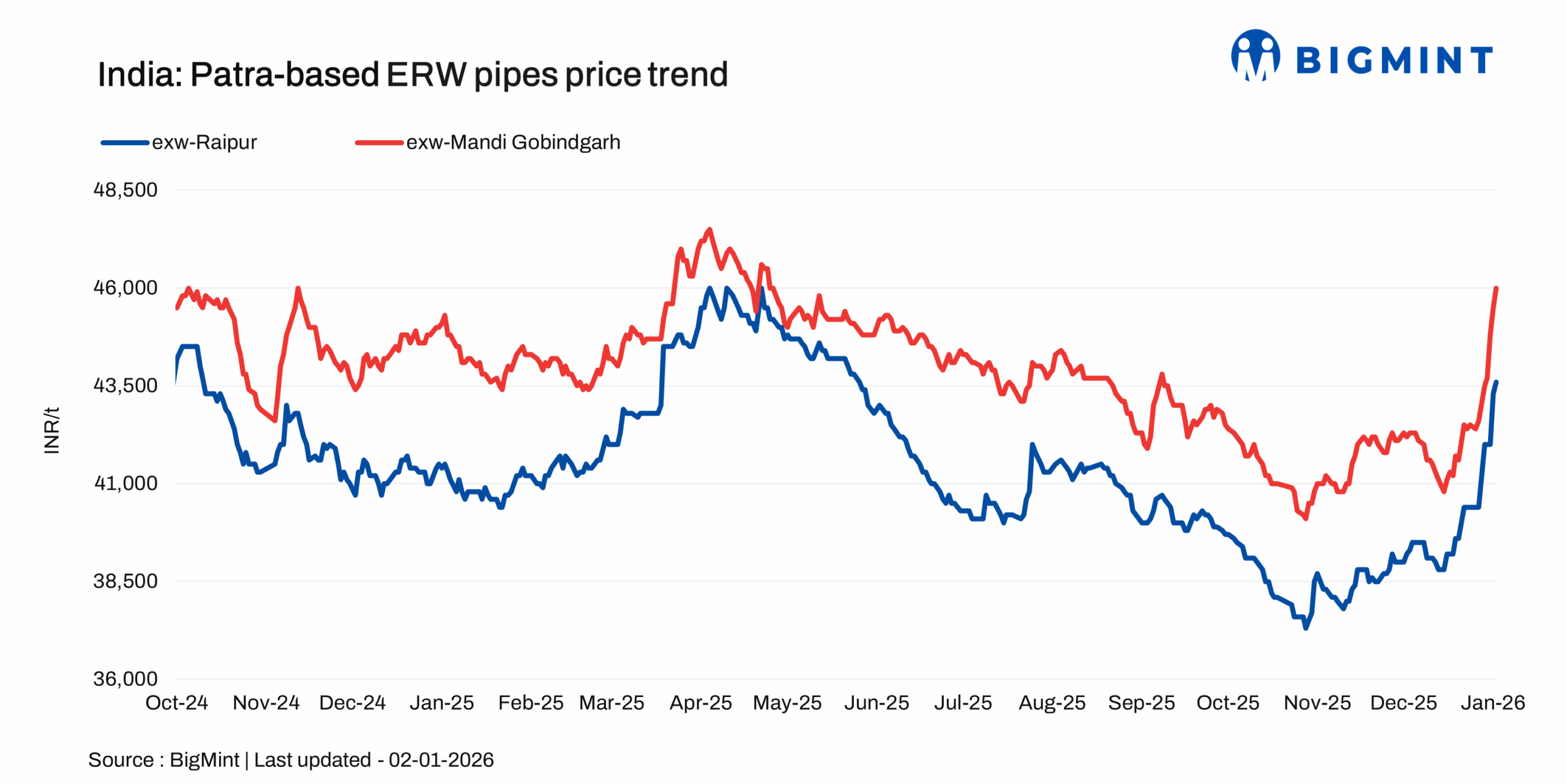 Prices in Raipur increased by INR 300/t d-o-d to INR 43,600/t exw-Raipur on 2 January 2026 as compared to INR 43,300/t a day ago. Moreover, prices in Mandi stood at INR 46,000/t exw-Mandi Gobindgarh, up by INR 500/t d-o-d against INR 45,500/t a day ago. Listed prices are exw and excluding 18% GST.
