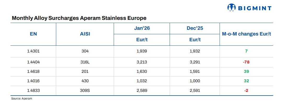 Leading stainless steel producer, Aperam, recently raised its surcharges on austenitic flat products for Jan’26. Post-revision, prices of the most-traded 304 (1.4301) grade stood at EUR 1,939/t ($2,275/t), up EUR 7/t ($8/t), and 316L (1.4404) at EUR 3,213/t ($3,770/t), up EUR 100/t ($117/t) m-o-m. Aperam has an annual capacity of over 2.5 mnt of stainless flat steel, with facilities in Europe, South America and Asia.