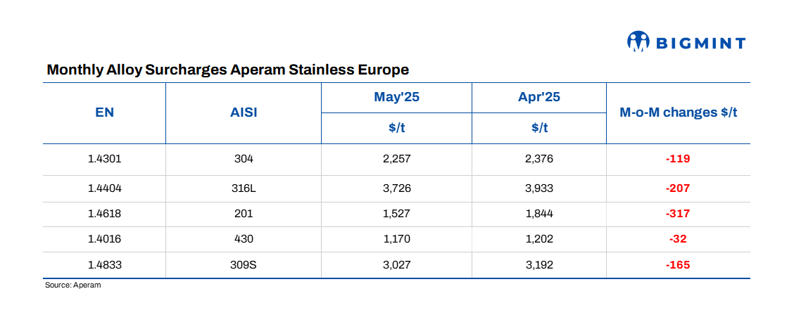 Aperam, a leading global stainless steel producer, recently announced its surcharges on the sales of austenitic flat products for May’25. Post-revision, prices of the most-traded 304 (1.4301) grade stood at EUR 1,987/t ($2,256/t), down by EUR 105/t ($119/t) from EUR 2,092/t ($2,375/t) in Apr’25. Aperam has an annual production capacity of over 2.5 mnt of flat stainless steel, with facilities in Europe, South America, and Asia.