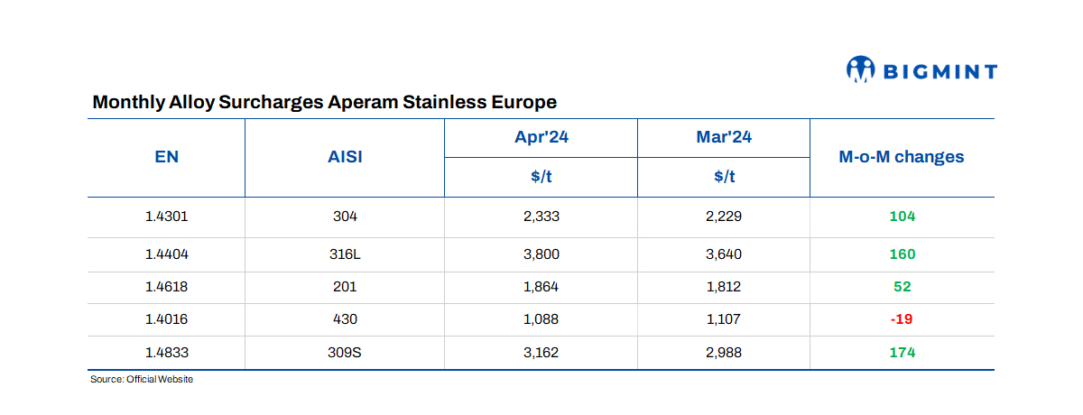 Aperam, a leading global stainless steel producer, has recently announced austenitic flat product surcharges for Apr’24 sales. Most traded 304 (1.4301) grade prices are at Euro 2,156/t ($2,333/t), up by Euro 96/t ($104/t) from Euro 2,060/t ($2,229/t) in Mar’24. Aperam has over 2.5 mnt/year of flat stainless steel capacity with facilities in Europe, South America, and Asia.