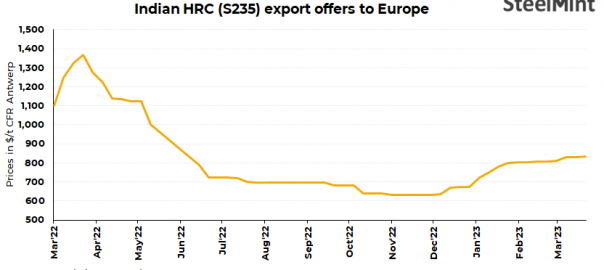 Indian HRC export (S275) offers remained stable at $835-840/t CFR EU in a recent deal. A private Indian steel major booked very small quantity of HRCs for export at $835/t CFR Antwerp and $840/t CFR UK last week. However, quantity remained elusive. Lengthening lead times and increasing offers in the domestic market could stimulate demand from overseas in Europe.