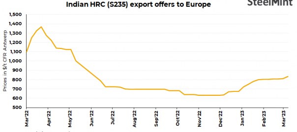 A private Indian steel major has booked around 25,000 t of HRCs for export at $830/t CFR Antwerp last weekend for end-April or early-May shipment. Fresh offers for HRCs (S275) were floated at $830-840/t CFR Antwerp, up $20/t as against last week’s $810-820/t CFR. Indian mills are likely to raise offers amid increasing domestic offers in the European market.