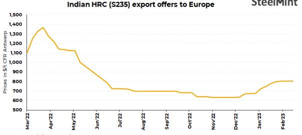 A private Indian steel major has booked around 40,000-50,000 t of HRCs for exports at $790-800/t CFR EU for Apr’23 shipment. The deal was concluded last week, as per sources. Fresh offers for HRCs (S275) were floated at $800-810/t CFR Antwerp. Buying interest for imported HRCs seems to be improving amid elevated domestic prices.