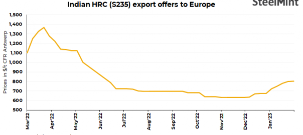 A private Indian steel major has booked a small parcel of HRC at $800/t CFR EU for Mar’23 shipment. The deal was concluded towards last weekend, as per sources. Fresh offers for HRC (S275) were heard at $800-810/t CFR Antwerp, up $5/t against last week’s $795-805/t CFR. Buying interest in the region has slowed down amid depreciation of the Euro against the USD.
