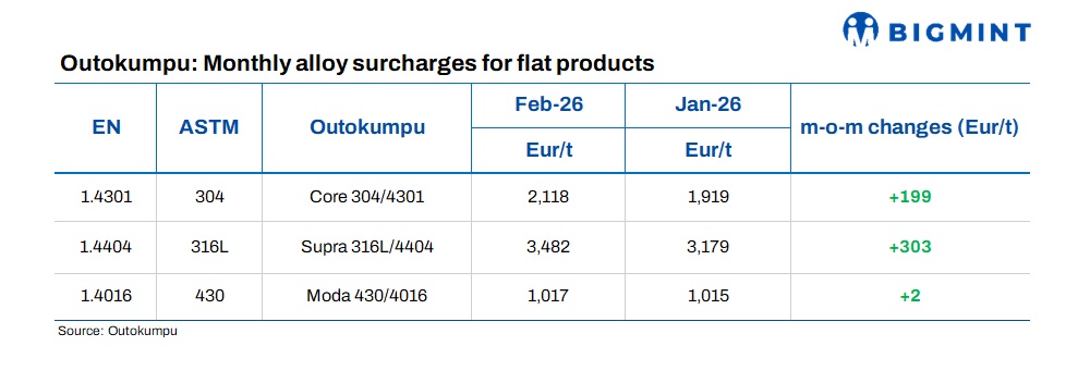 Outokumpu has raised alloy surcharges for flat stainless steel products for Feb’26, tracking higher raw material costs across major grades.
