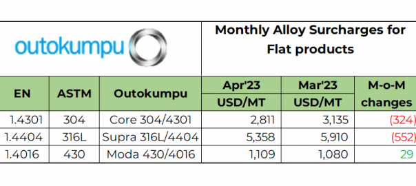 Finish stainless steelmaker, Outokumpu, has decreased surcharges for stainless steel flat alloy products for Apr’23, except for 430 series. Prices are: