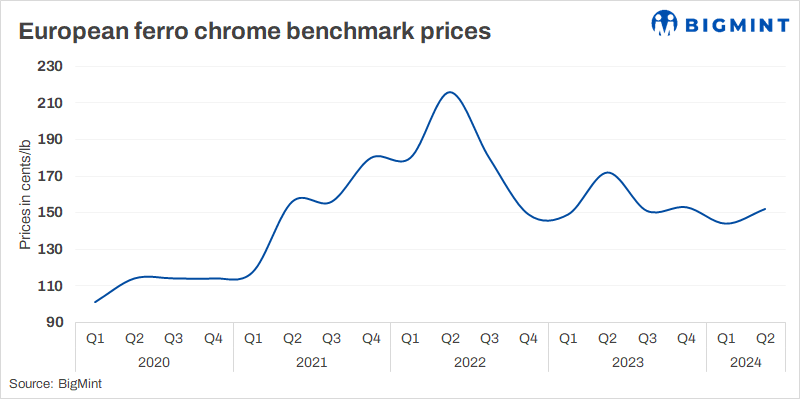Merafe, a major ferro chrome producer in South Africa, released the European benchmark’s ferro chrome prices at 152 cents/lb for Q2CY’24, marking a 5.6% (8 cents/lb) q-o-q hike. The increase in prices might be attributed to a supply shortage resulting from production cuts caused by electricity supply issues in South Africa.